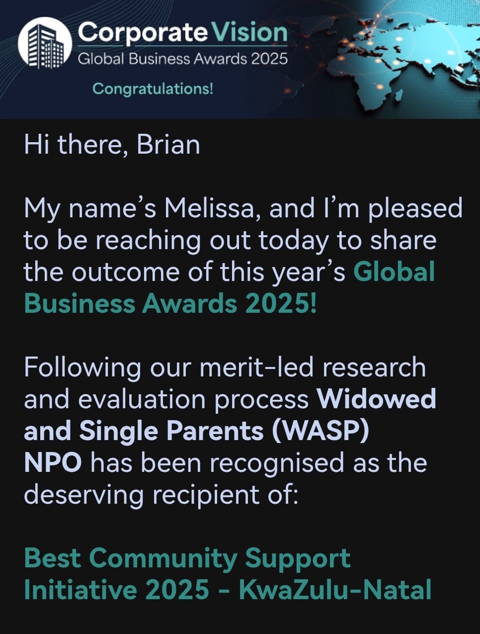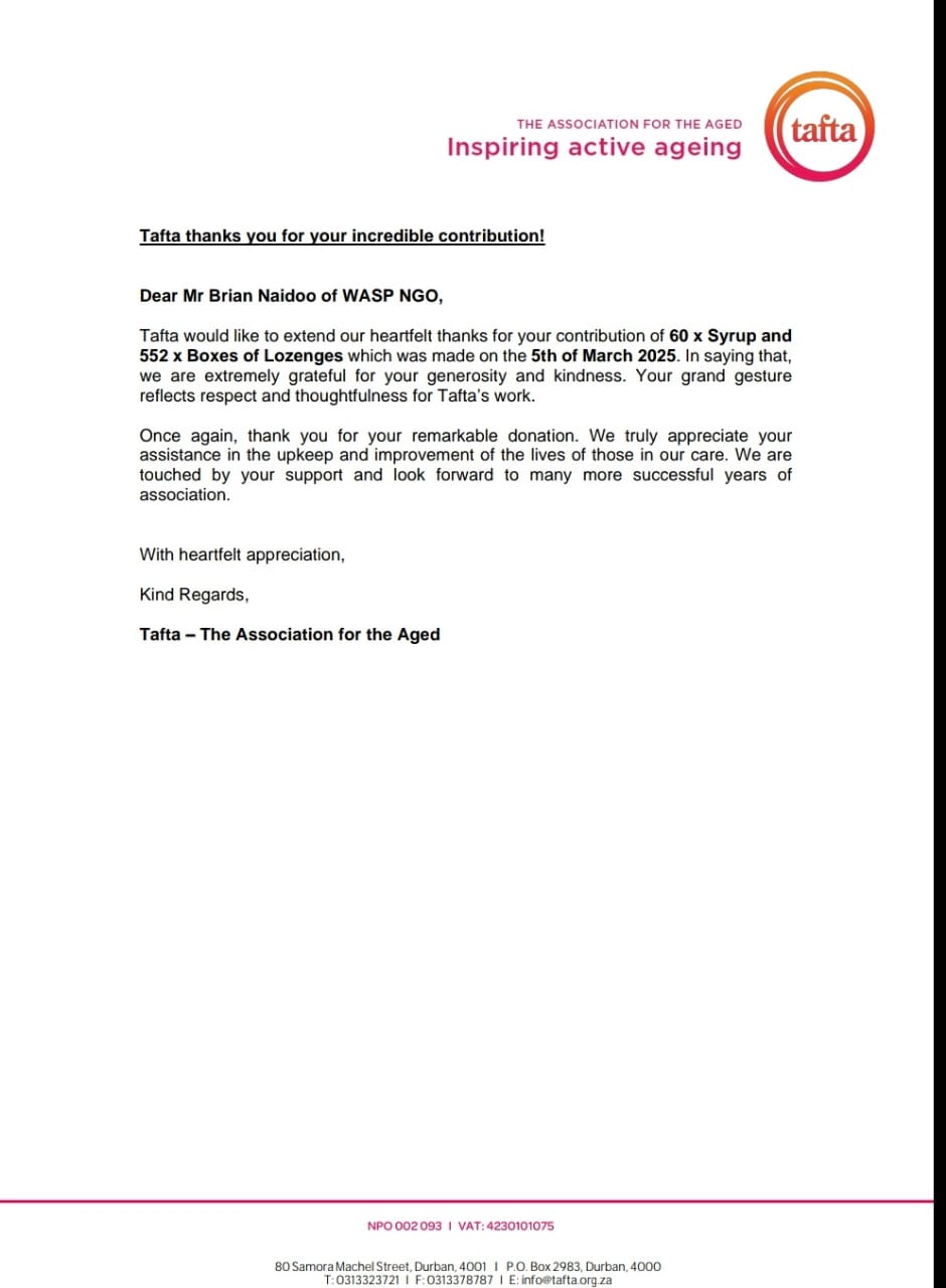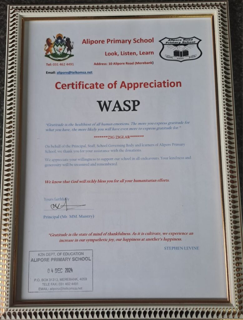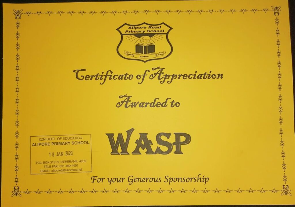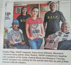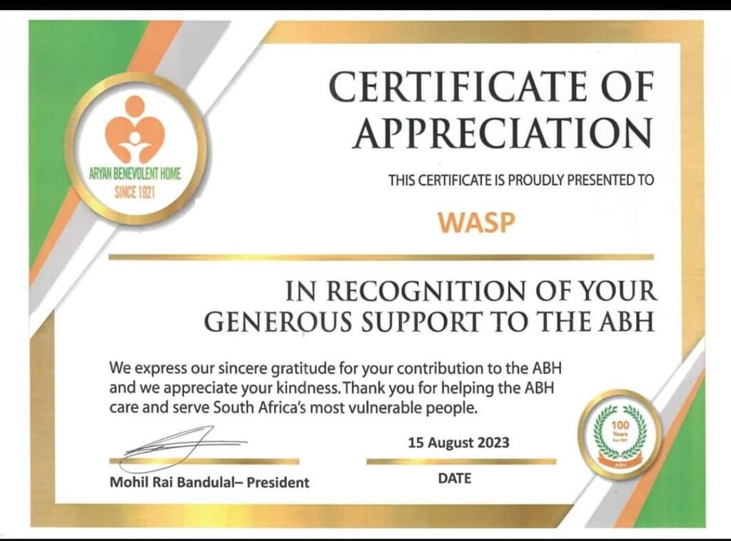 We are registered as a non-profit organisation with Department of Social Development. We have been granted Section 18A tax status with SARS. Donors will receive a Donation certificate to be submitted with Income taxes. Wasp is BBBEE certified. We had a yearning of giving back to the community and wanting to make a difference. We provide assistance to our identified recipients in Merebank, Wentworth, Bluff, Clairwood, Montclair, Yellowwood Park,  Chatsworth, Phoenix, Durban North, Verulam and  Tongaat.